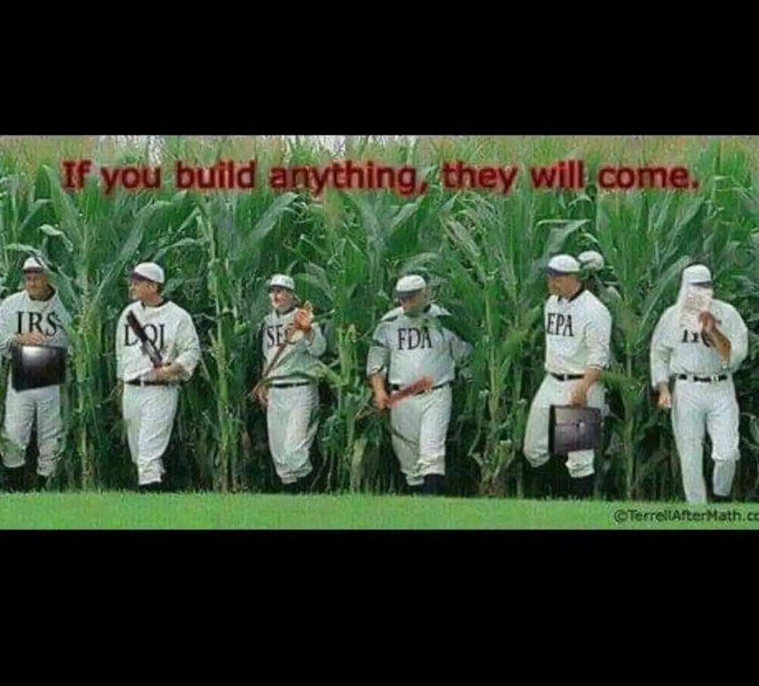 30. Too many agencies, too many rules, too many chefs in the kitchen. The vast majority of human activity should be, again, totally removed, from government purview.