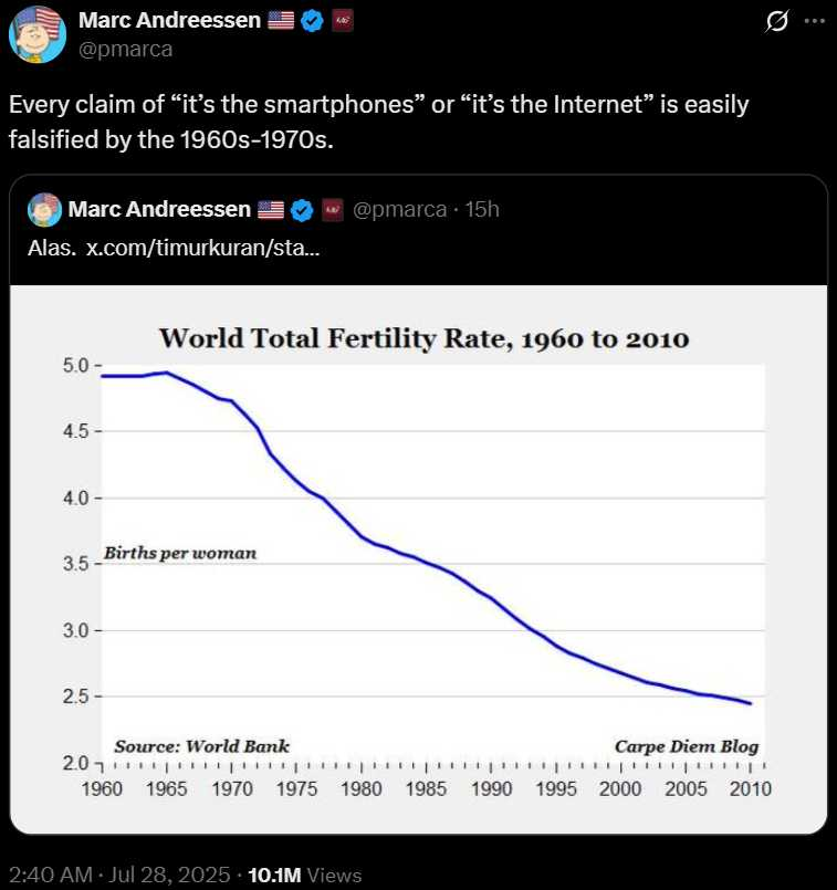 Oral contraceptives, invented 1957, approved 1960, by 1965 the Reproductive Fraction was saturated. Female solipsism took care of the rest.
